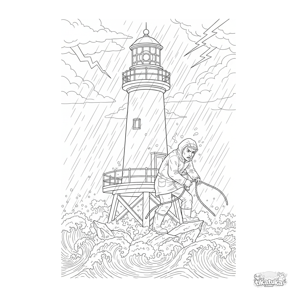 Раскраска для детей 10-12 лет: драматичная сцена маяка на платформе в штормовом море. Детализированное изображение хранителя, волн и башни для творческого раскрашивания.