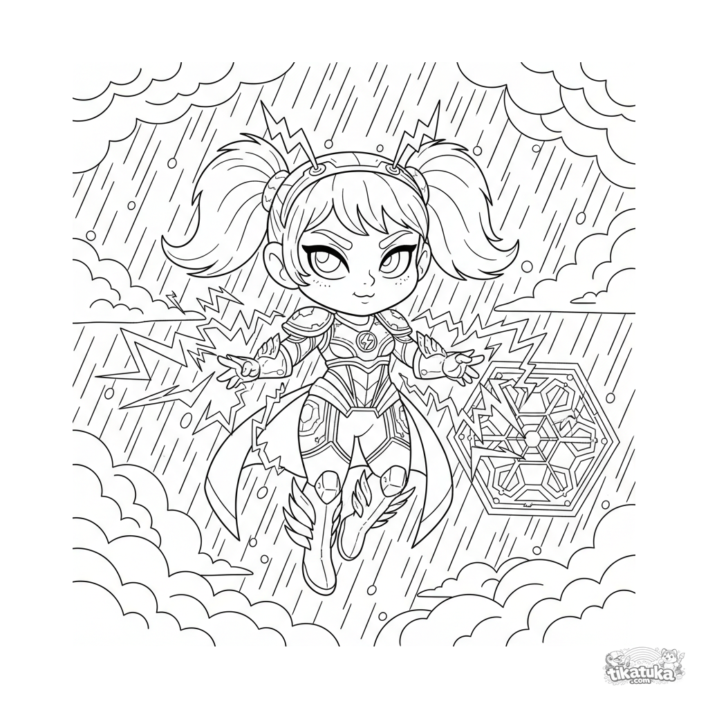 Раскраска для детей 10-12 лет: супергерой с силами молнии парит в грозовом небе, заряжая энергией большое устройство. Динамичная сцена со вспышками и тучами.