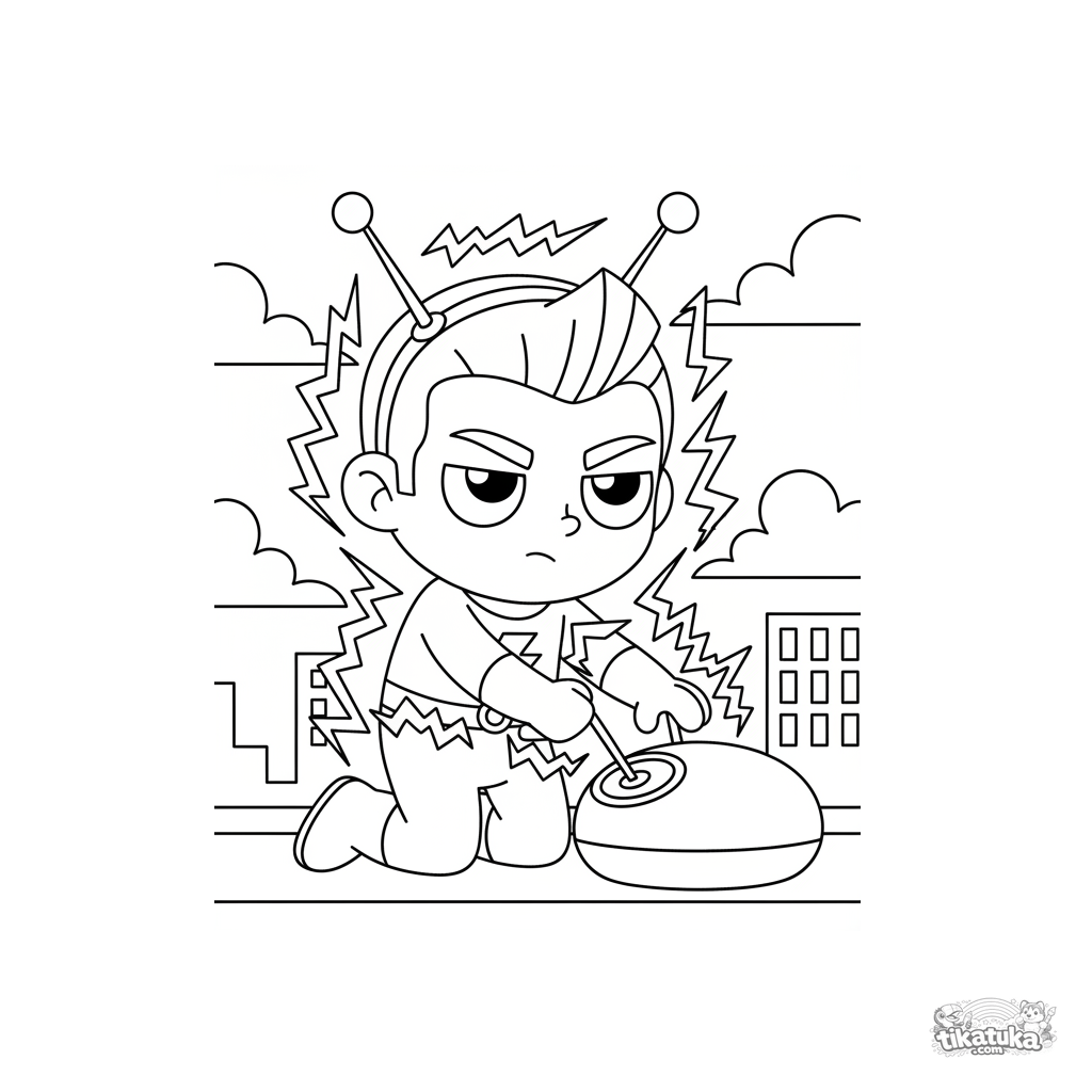 Раскраска для детей 7-9 лет: супергерой с силами молнии заряжает устройство на городской крыше во время грозы. Динамичная сцена в стиле 80-х мультфильмов.