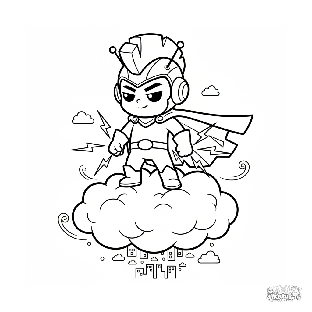 Раскраска для детей 7-9 лет: супергерой, управляющий молнией, стоит на грозовой туче, от его рук исходят электрические разряды, внизу виден город.