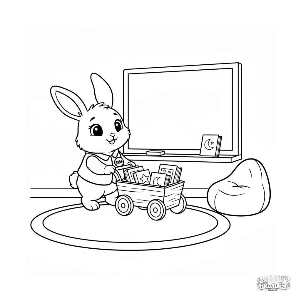 Раскраска для малышей 2-3 года: пушистый кролик-библиотекарь везёт тележку с книгами в школьном классе. Простая сцена с крупными формами.