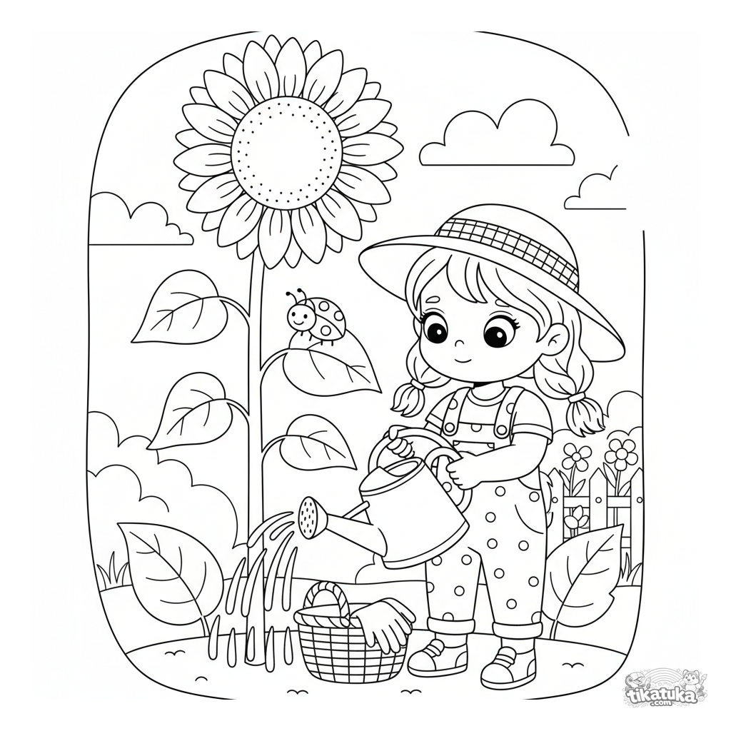 Раскраска с милой девочкой-садовником, поливающей огромный подсолнух. Для детей 4-6 лет. Сцена с лейкой, божьей коровкой и корзинкой для раскрашивания.