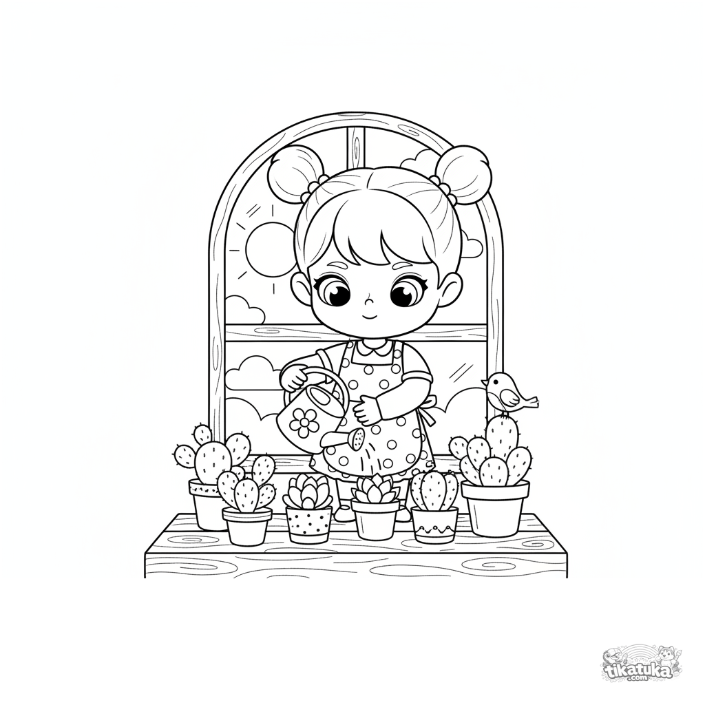 Раскраска с милой девочкой-садоводом, которая поливает свои суккуленты на подоконнике. Для детей 4-6 лет. Милый и спокойный сюжет.