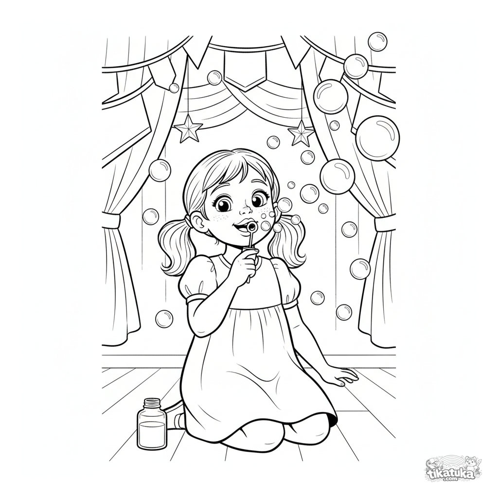 Раскраска для детей 4-6 лет: девочка пускает мыльные пузыри в праздничном зале. Мягкие контуры, узнаваемые формы, полная фигура, широкие поля.