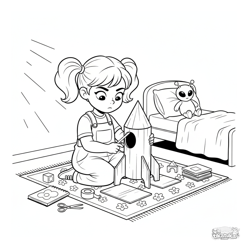Раскраска с девочкой, строящей ракету из картона в своей комнате. Для детей 4-6 лет. Поощряет творчество и воображение.