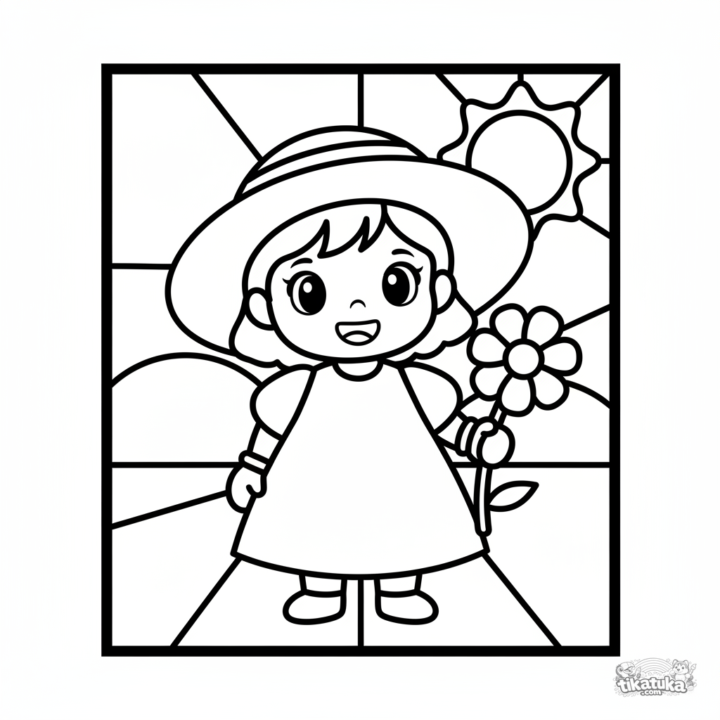 Раскраска для девочек 2-3 лет: милая девочка в большой шляпе с цветком. Крупные детали, простые контуры, легко раскрашивать. Раскраска по номерам для детей.