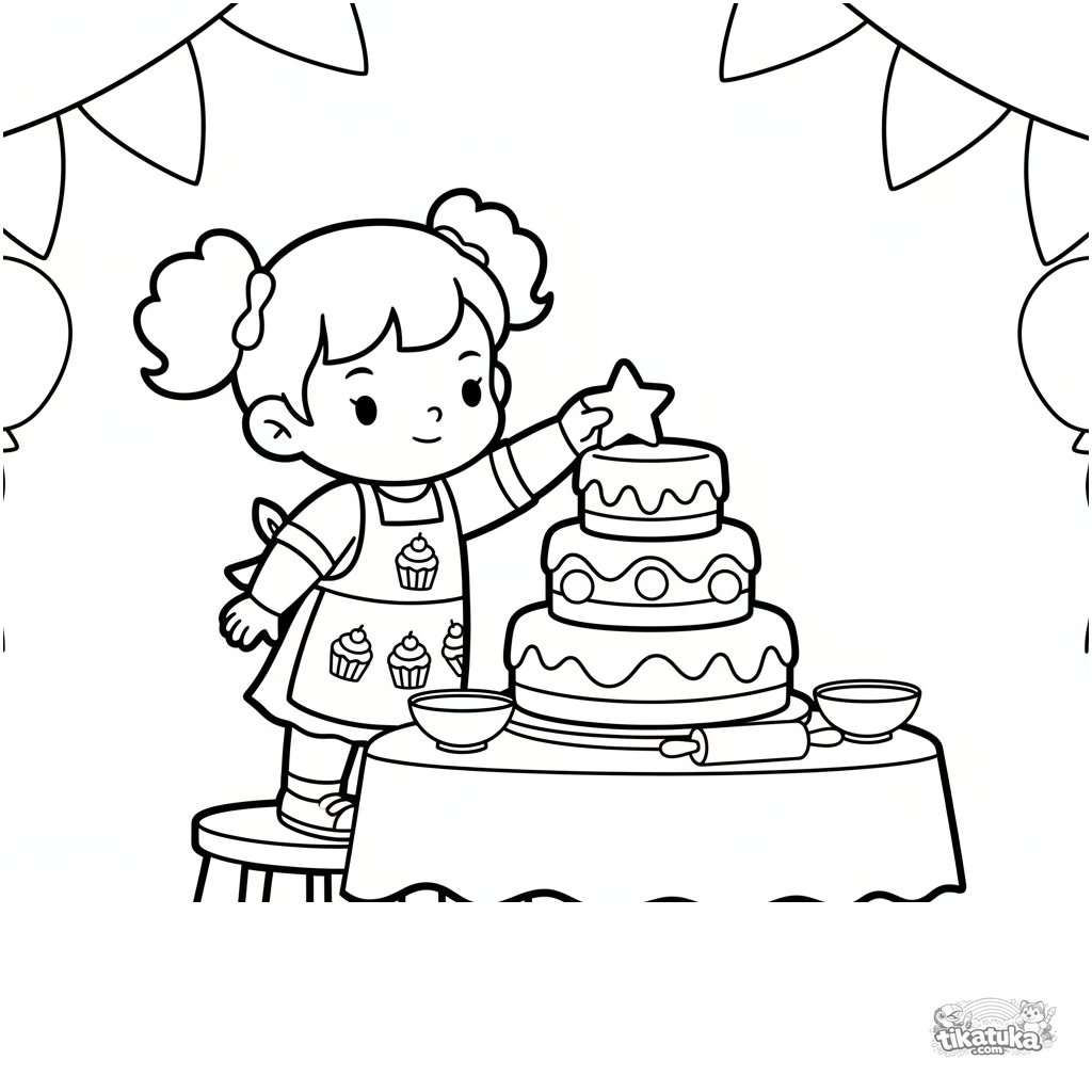 Раскраска для малышей 2-3 лет: маленькая девочка в фартучке украшает праздничный торт в банкетном зале. Крупные простые формы, мало деталей, широкие поля для раскрашивания.