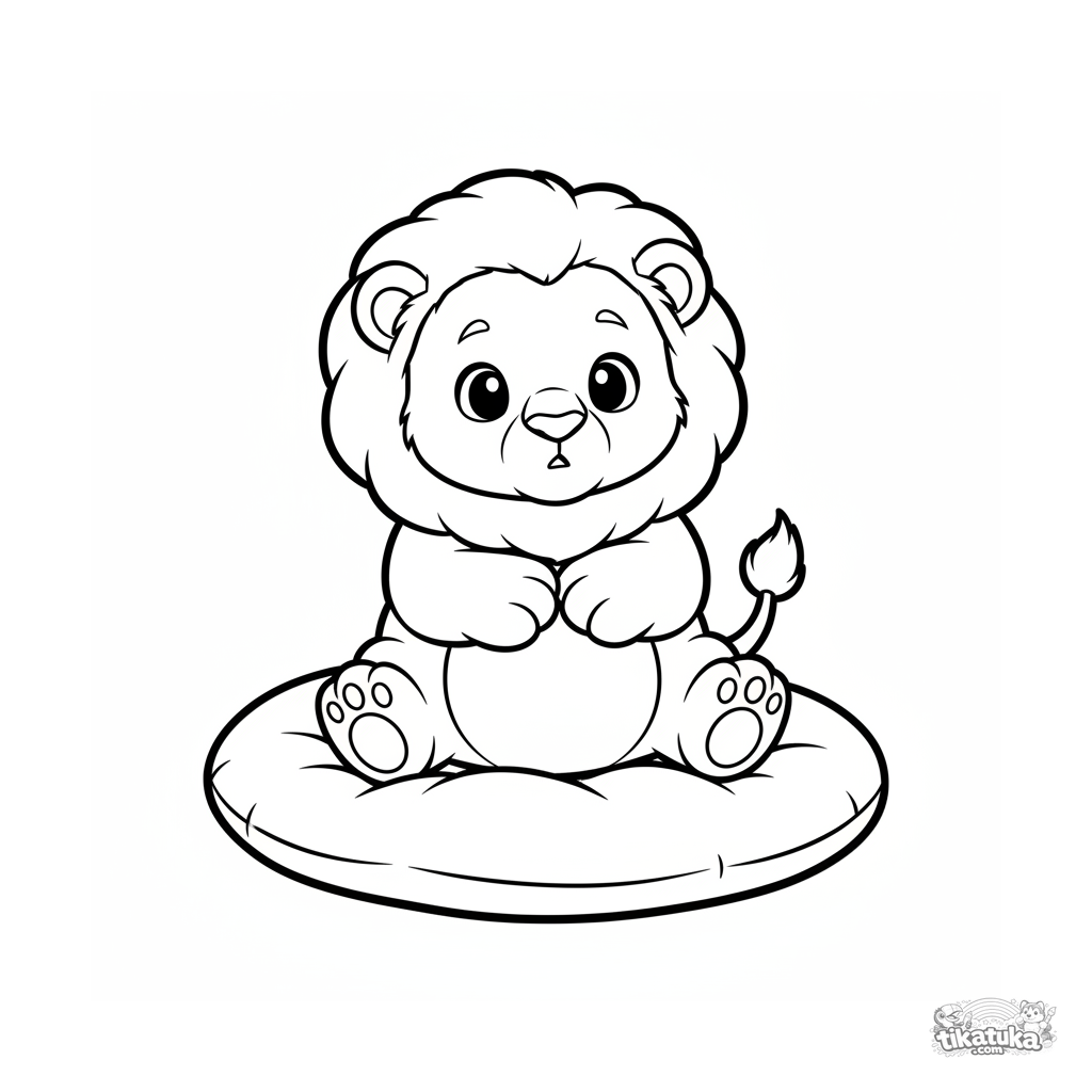 Раскраска для самых маленьких: плюшевый львёнок с гривой сидит на подушке. Простой узнаваемый контур, доброе выражение мордочки, мало сложных деталей.
