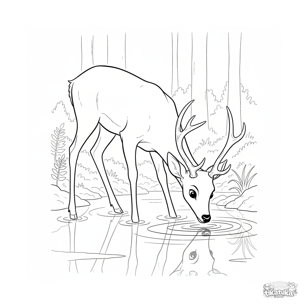 Раскраска для детей 4-6 лет: изящный олень пьёт воду из лесного ручья в сумерках. Мягкий акварельный стиль наброска, спокойная атмосфера.