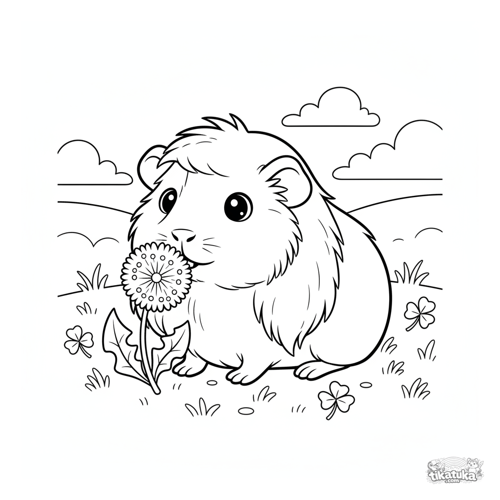 Раскраска для детей 4-6 лет: длинношёрстная морская свинка в лугу с одуванчиком. Милое животное в простой сцене, идеально для раскрашивания.