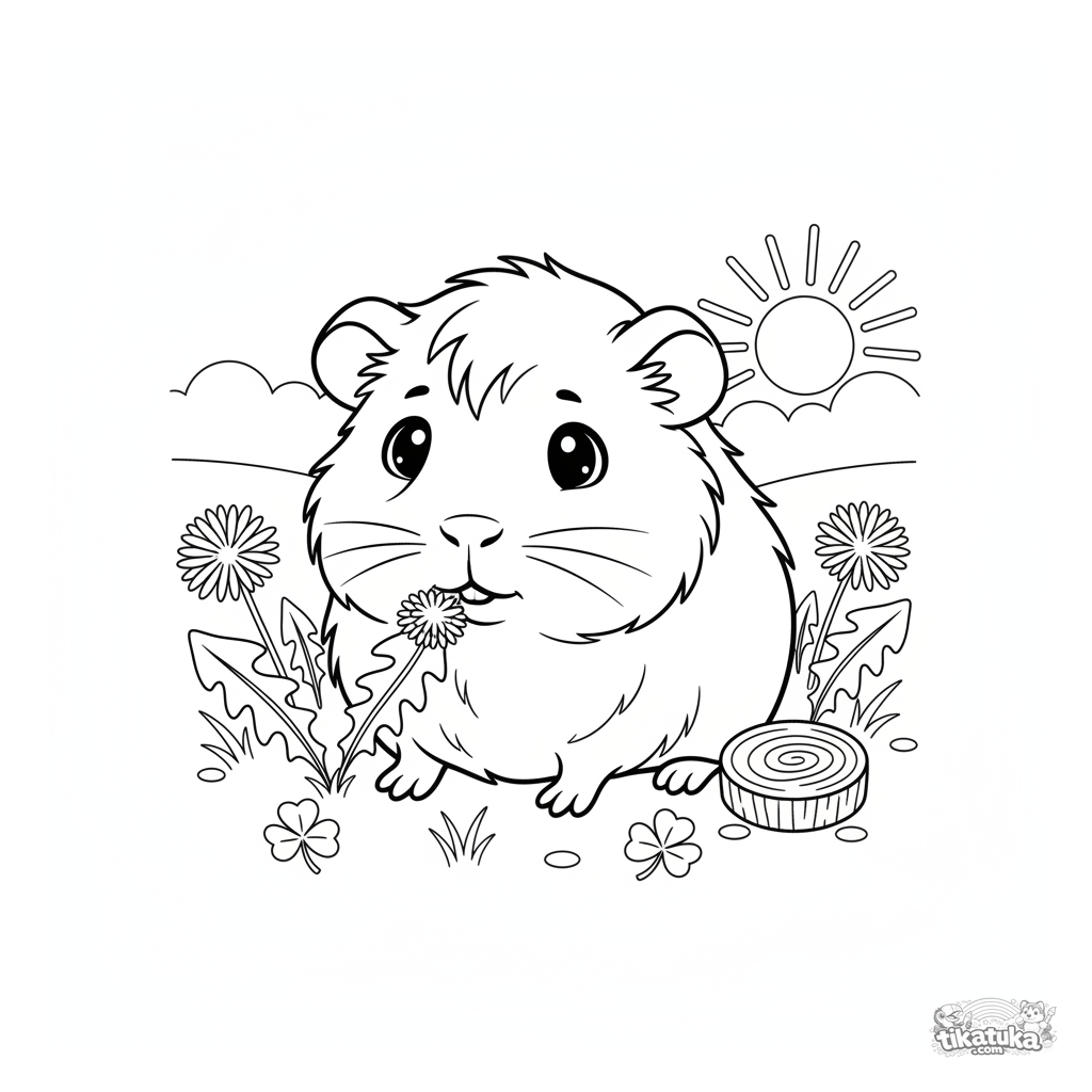Раскраска с милой морской свинкой в лугу. Для детей 4-6 лет. Изображена пушистая морская свинка, жующая лист одуванчика на фоне клевера, с игрушкой рядом.