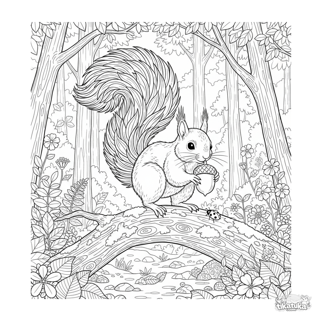 Раскраска с белкой, балансирующей на замшелом бревне. Для детей 6-9 лет. Изображена пушистая белка с желудем в лапках в лесной полянке.