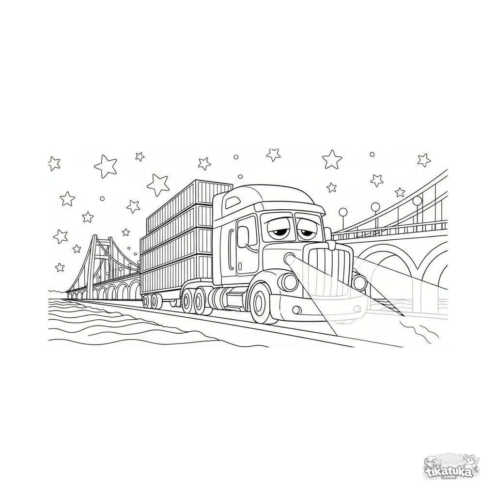 Раскраска для детей 7-9 лет: большая фура с контейнерами едет по освещённому мосту над рекой ночью. Атмосферная сцена в стиле графического романа.