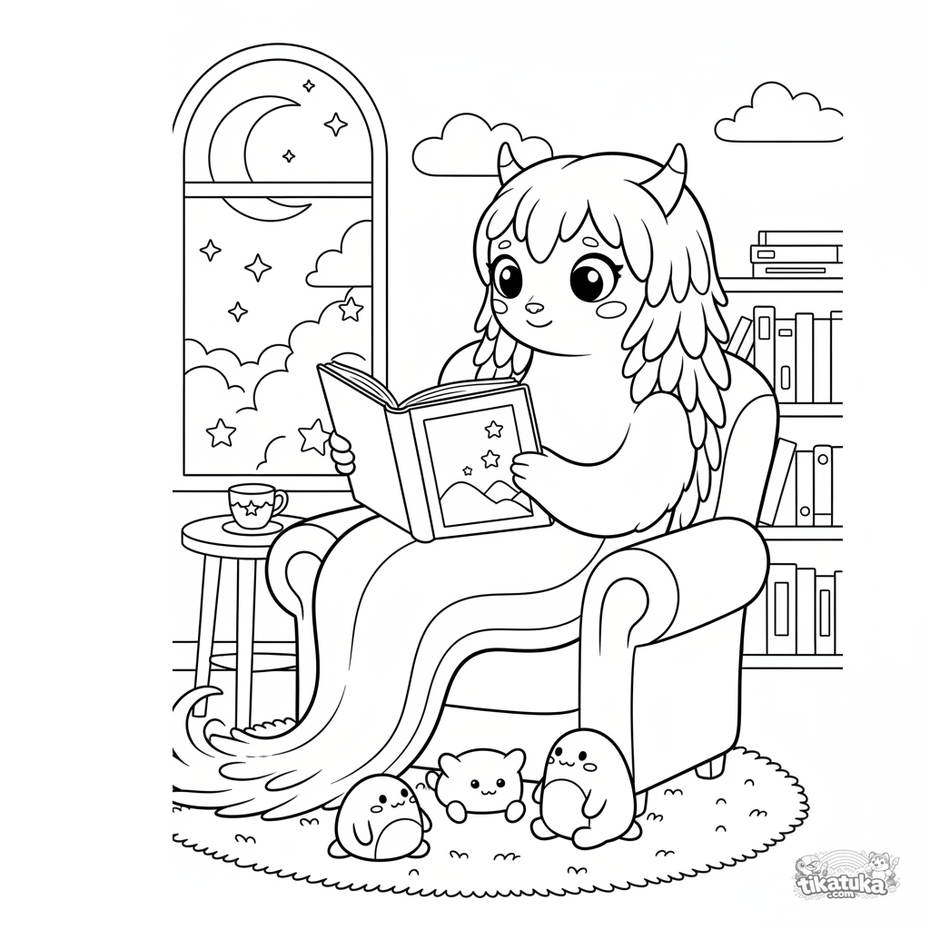 Раскраска для детей 4-6 лет: длинный монстр с перьевыми волосами читает сказку игрушкам в уютной спальне при лунном свете. Спокойная сцена для раскрашивания.