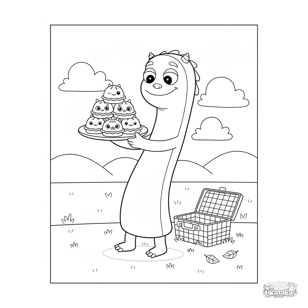 Раскраска для детей 4-6 лет: длинный, растянутый монстр с широкой верхушкой аккуратно передаёт тарелку с маленькими пирожками на пикнике. Милая и спокойная сцена.