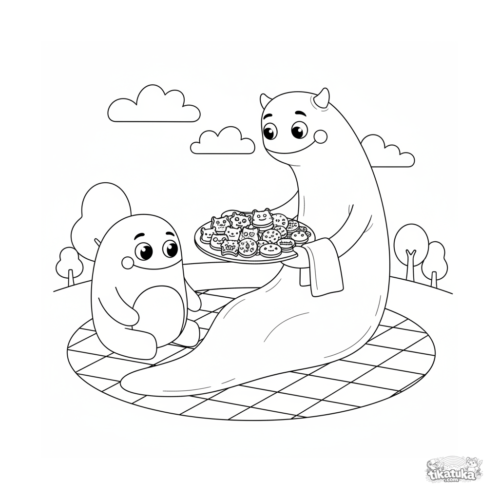 Раскраска для детей 7-9 лет: длинный, добрый монстр делится тарелкой с печеньем в форме монстров со своим другом на пикнике. Сцена о дружбе и щедрости.
