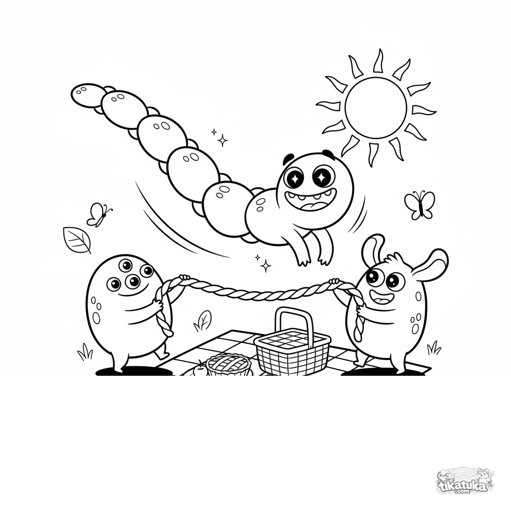Раскраска для детей 7-9 лет: длинный монстр прыгает через скакалку из лакрицы с друзьями на пикнике. Активная и дружеская сцена.