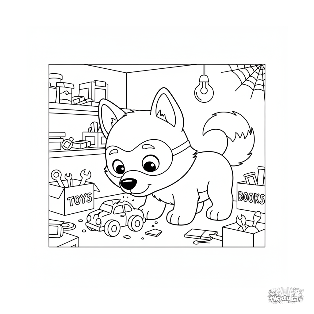 Раскраска: собака Лютик в подвале находит старую красную машинку. Скачайте, распечатайте или раскрасьте онлайн!