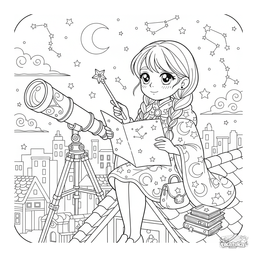 Раскраска в стиле детского аниме: магическая девочка изучает звёзды с городской крыши. Уникальная сцена с телескопом и картой для детей 10-12 лет.