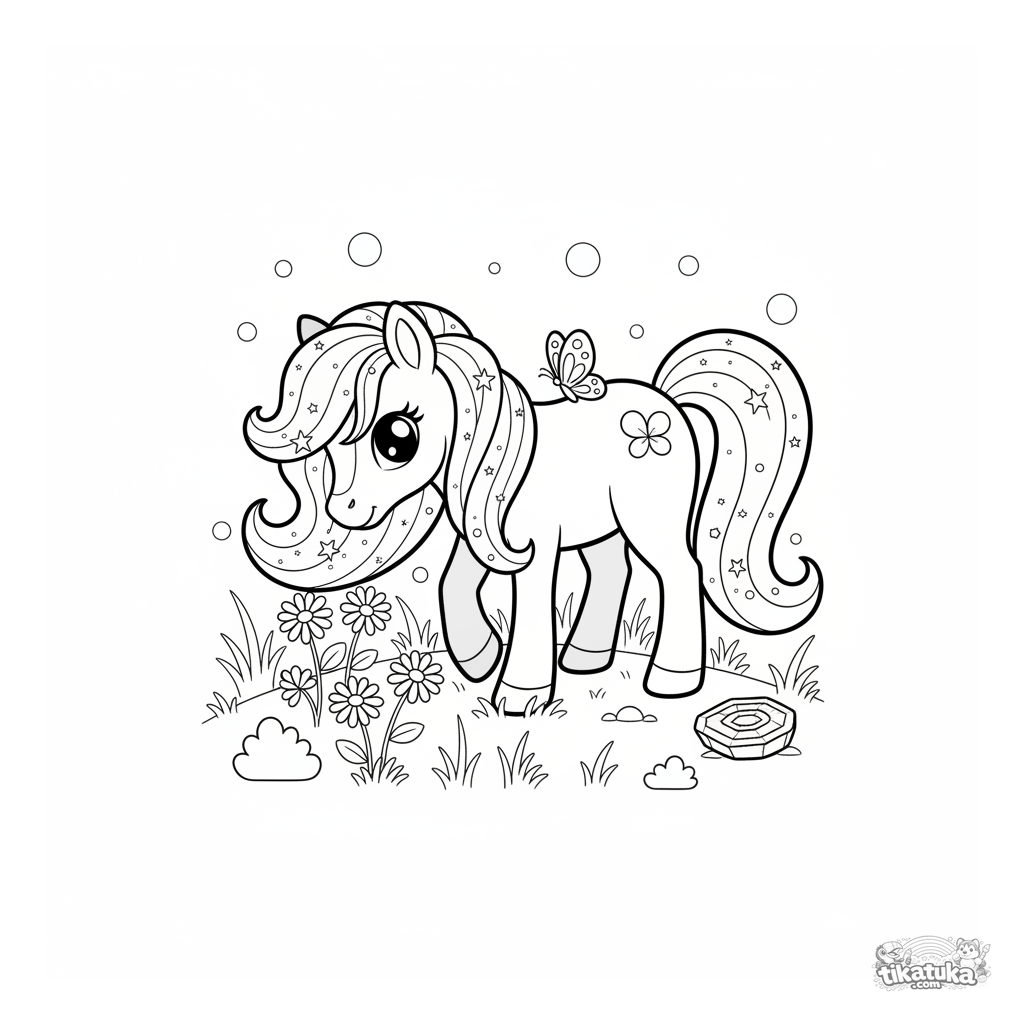 Раскраска в теме «Пони» с уровнем «Средне». Подходит для возраста 3-6 лет, удобно распечатывается дома и сразу открывается в онлайн-режиме.