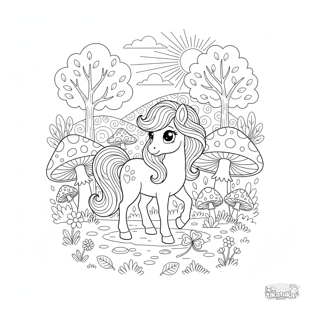 Раскраска для детей 7-12 лет: волшебный пони с гривой, похожей на северное сияние, пасётся на поляне с гигантскими грибами. Высокая детализация, сказочная сцена.