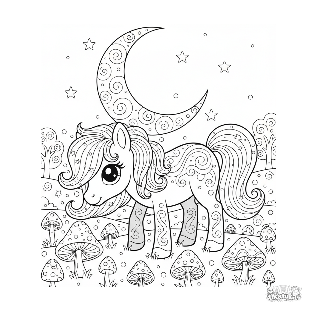 Сложная раскраска для детей 7-12 лет: волшебный пони с гривой как северное сияние пасётся на поляне со светящимися грибами под луной. Детализированная магическая сцена.