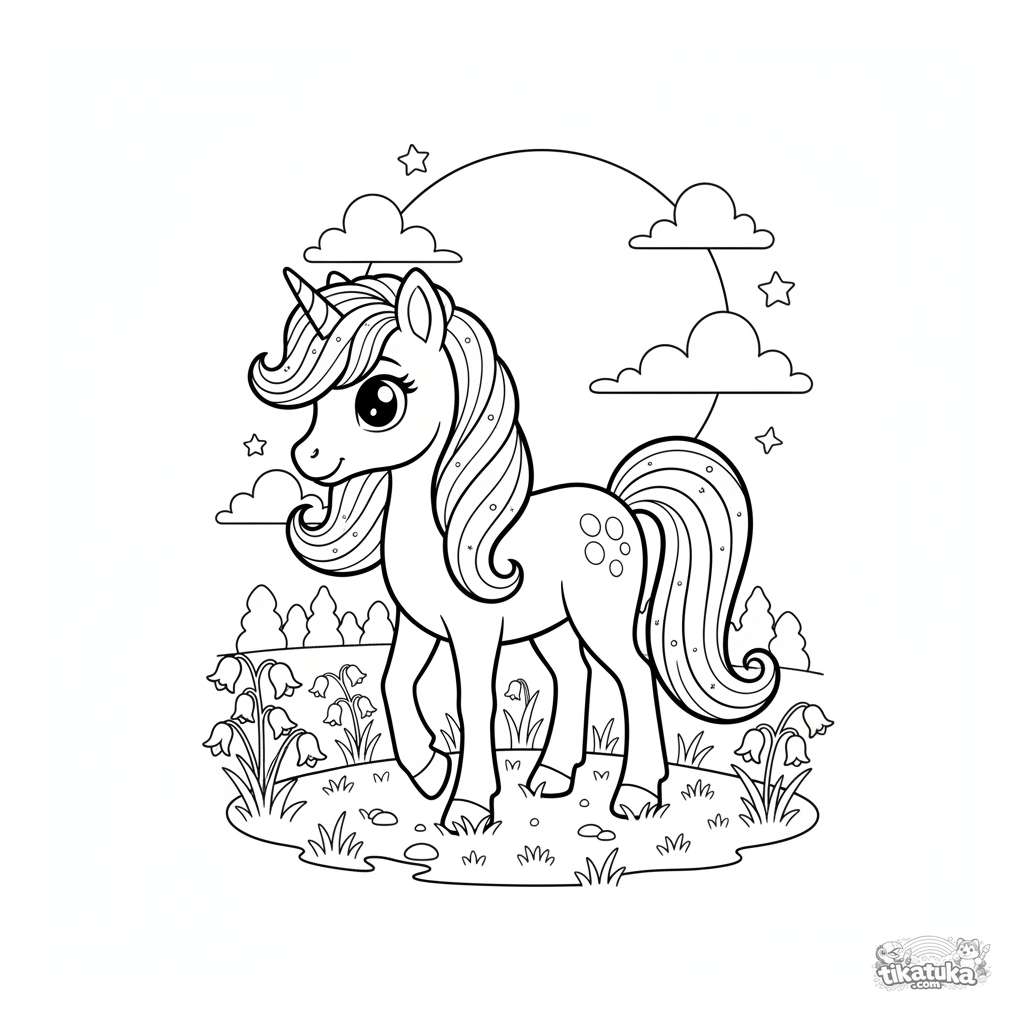 Раскраска для девочек 4-6 лет: волшебный пони со светящейся гривой в лунном лугу. Сказочная и спокойная сцена, идеальная для раскрашивания.