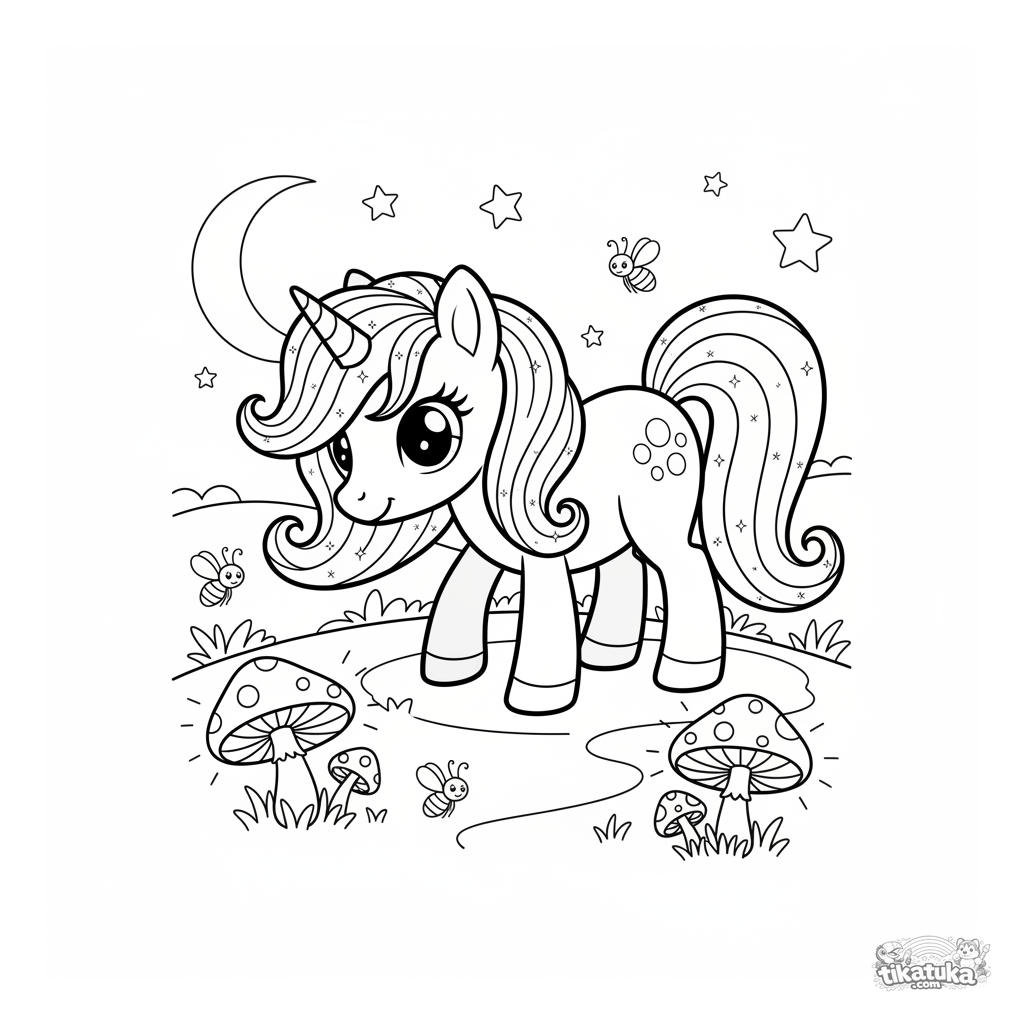 Раскраска для девочек 4-6 лет: волшебный пони с рогом пасется на лунной поляне со светящимися грибами. Сказочная и нежная сцена.