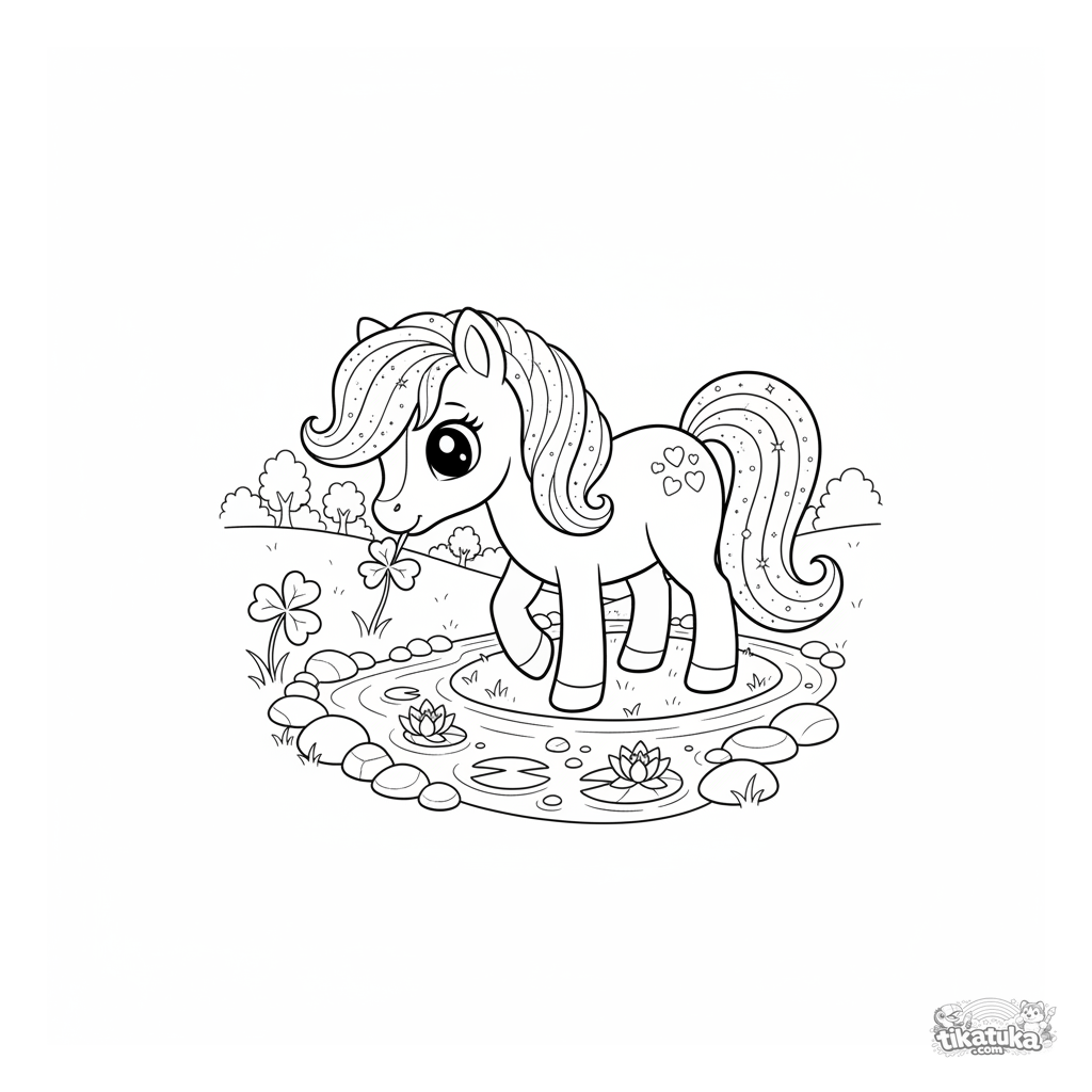 Раскраска с волшебным пони, который пасётся у кристального ручья. Для девочек 4-6 лет, сказочная и спокойная сцена.
