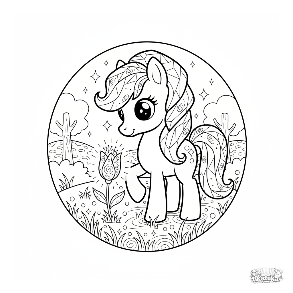 Раскраска в теме «Пони» с уровнем «Сложно». Подходит для возраста 7+ лет, удобно распечатывается дома и сразу открывается в онлайн-режиме.