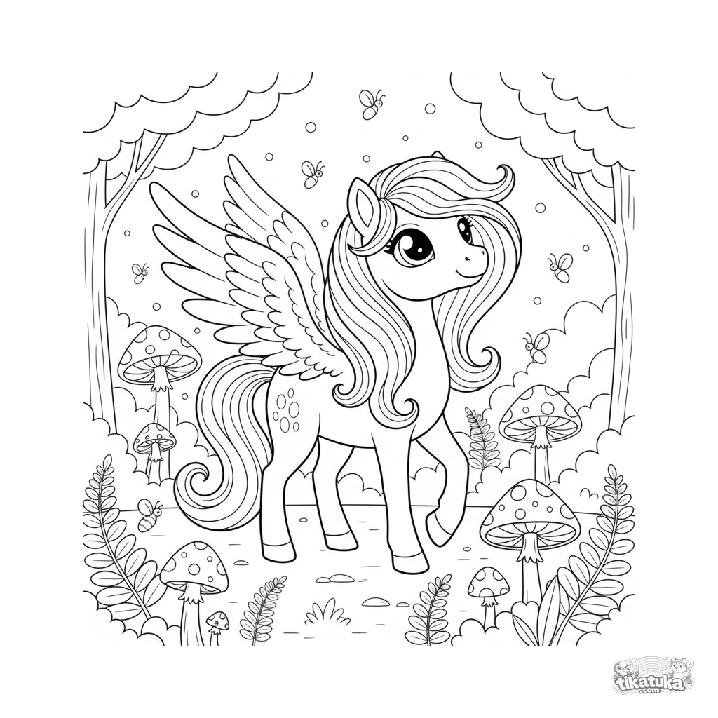 Раскраска для девочек 4-6 лет. Волшебный пони с перьевыми крыльями и светящейся гривой в лунном лесу. Сказочная и нежная сцена.