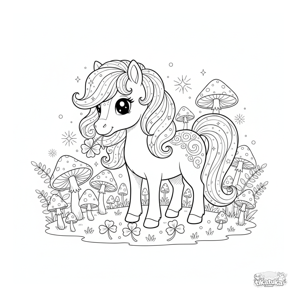 Раскраска для детей постарше: волшебный пони с сияющей гривой пасётся в зачарованной роще. Высокая детализация и сказочные элементы для возраста 7-12 лет.