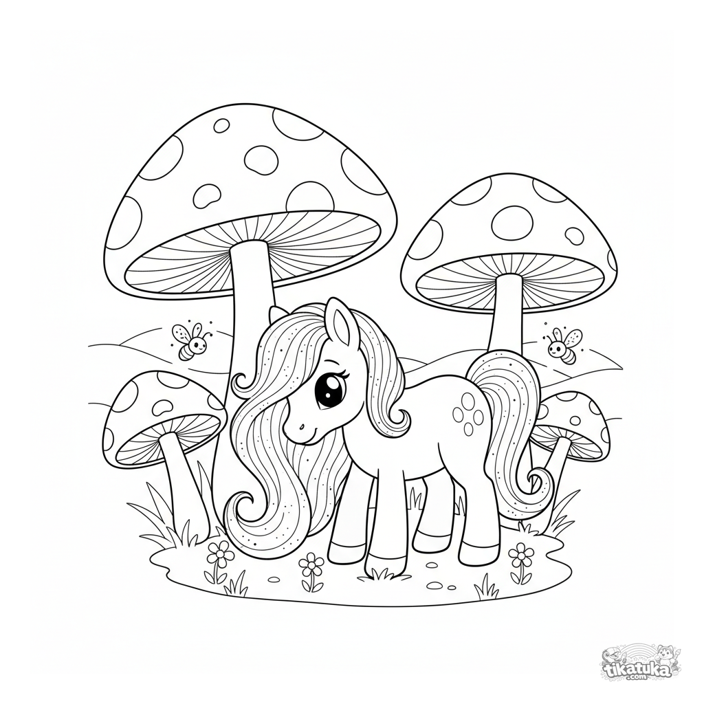Раскраска с волшебным пони, чья грива переливается, как звёздная пыль, на лугу с гигантскими грибами. Для девочек 4-6 лет, сказочный сюжет.