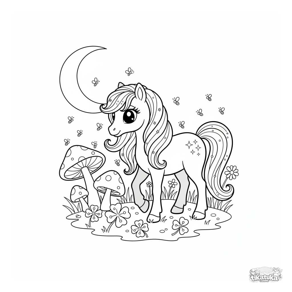 Раскраска для девочек 4-6 лет: волшебный пони с сияющей, как звёздная пыль, гривой пасётся на росистом клевере в лунном свете. Сказочная и спокойная сцена.