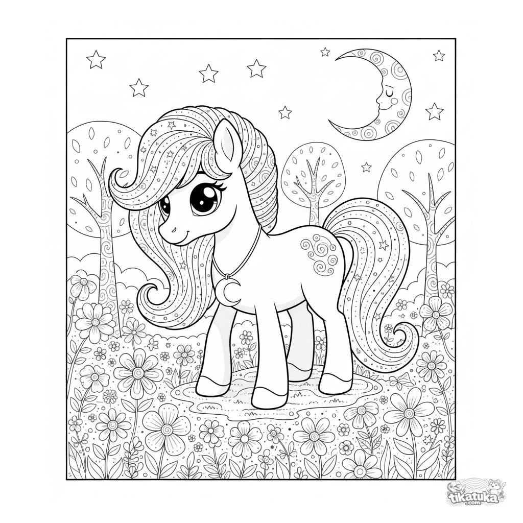 Раскраска в теме «Пони» с уровнем «Сложно». Подходит для возраста 6-9 лет, удобно распечатывается дома и сразу открывается в онлайн-режиме.