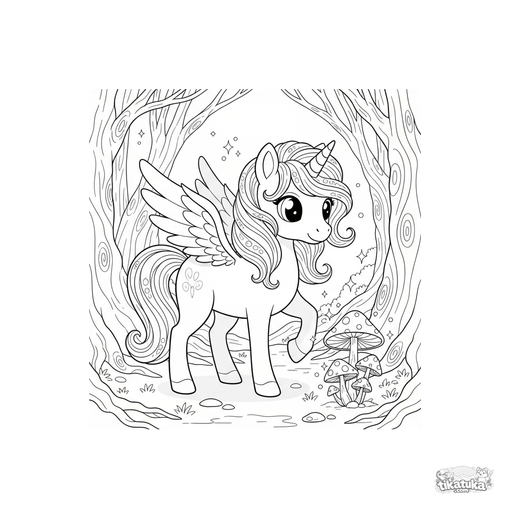 Раскраска с волшебным крылатым пони-единорогом в зачарованном лесу. Для детей 5-8 лет. Пони смотрит на светящиеся грибы, вокруг летают искорки, видны древние корни деревьев.