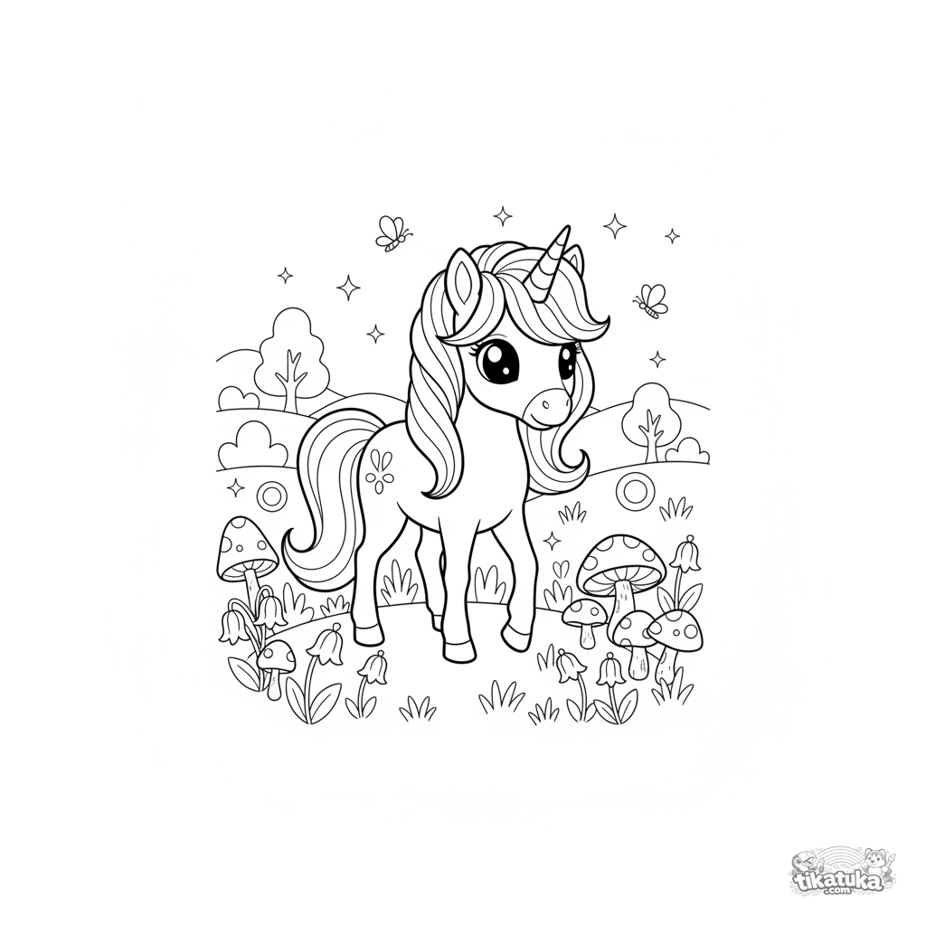 Раскраска с волшебным пони, который пасётся на зачарованном лугу со светящимися грибами. Для детей 3-6 лет. Милая и простая сказочная сцена.
