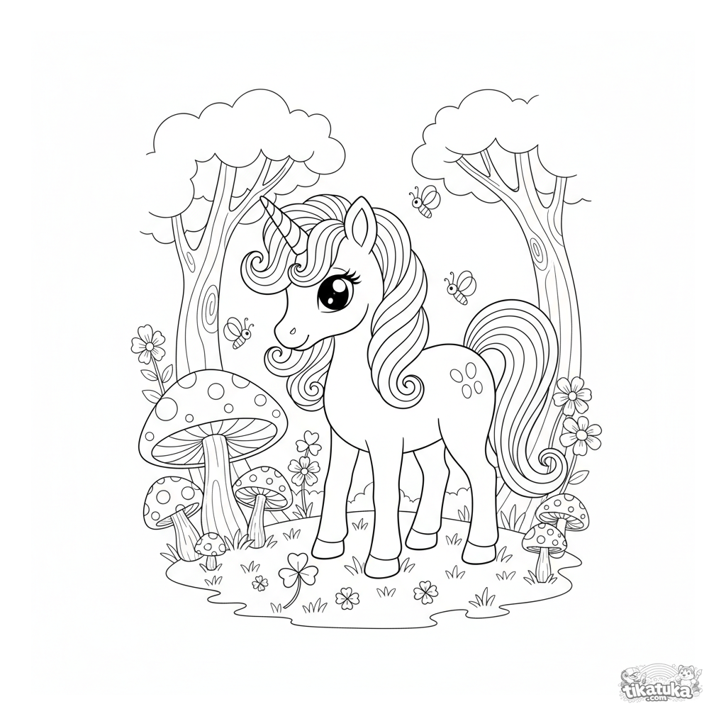 Раскраска с волшебным единорогом, который пасется на поляне в лесу среди светящихся грибов. Для детей 3-6 лет. Единорог спокоен, вокруг него порхают светлячки.