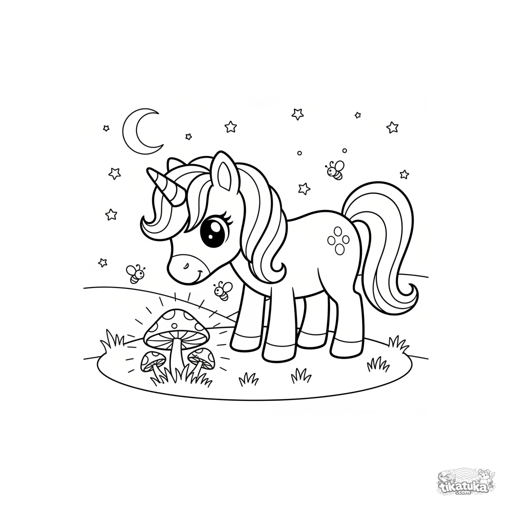 Раскраска с волшебным пони-единорогом, который пасется в лунном лугу у круга светящихся грибов. Для детей 3-6 лет. Сказочная и спокойная сцена.