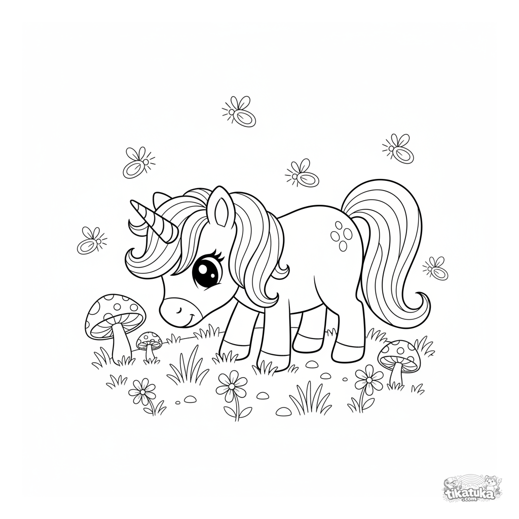 Раскраска для девочек 4-6 лет. Волшебный пони-единорог с волнистой гривой пасется на лугу при свете луны среди светящихся грибов. Сказочная сцена.