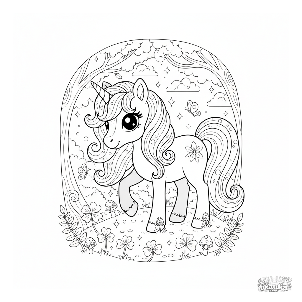 Сложная раскраска для детей 8-12 лет: волшебный пони-единорог пасется в зачарованной поляне со светящимися грибами. Много деталей для творческого раскрашивания.