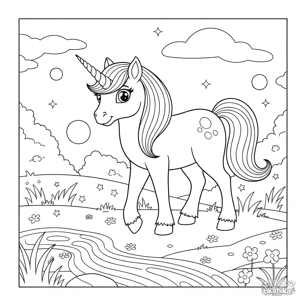Раскраска с волшебным пони-единорогом, пасущимся на зачарованном лугу у кристального ручья. Для детей 3-6 лет. Сцена с звёздчатыми цветами и светящимися шарами.