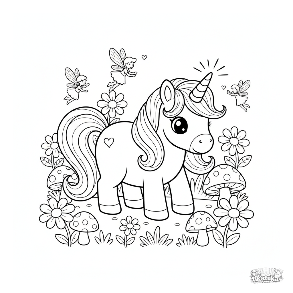 Раскраска с волшебным пони-единорогом, пасущимся на зачарованном лугу. Для детей 3-6 лет. Светящиеся грибы, феи и простые контуры.