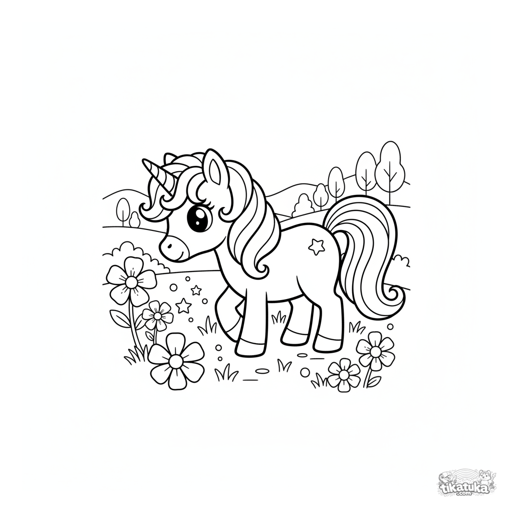Раскраска для девочек 4-6 лет: волшебный пони-единорог пасётся на зачарованном лугу со светящимися цветами. Милая и простая сказочная сцена.