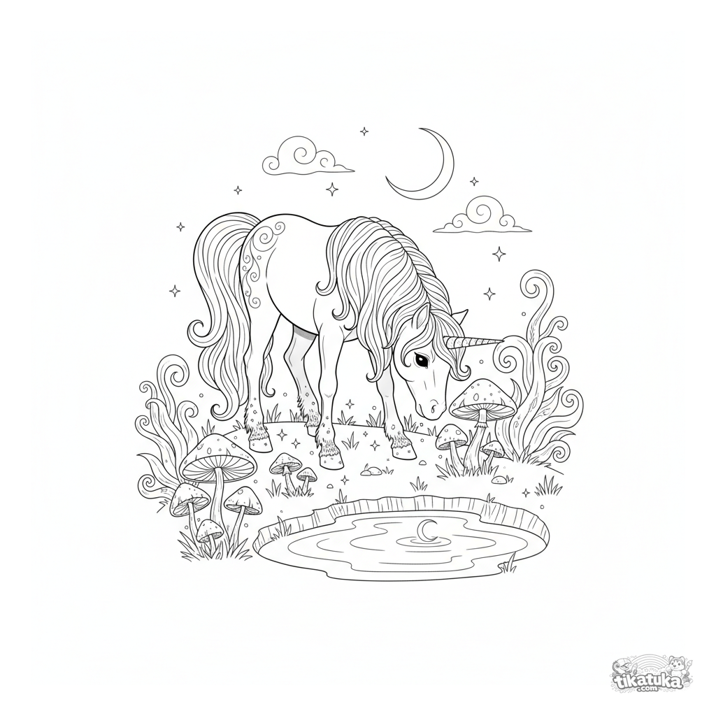 Раскраска для девочек 7-12 лет: волшебный пони-единорог с длинной гривой пасётся на светящихся грибах в зачарованной лунной роще. Детализированная сцена со звёздами и светлячками.