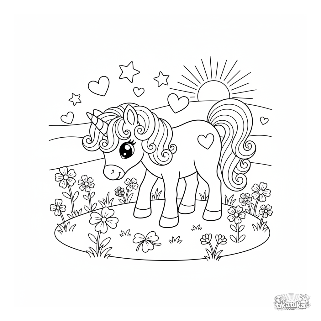 Раскраска для девочек: волшебный пони-единорог пасётся на поляне с радужными цветами. Милая и фантазийная сцена для детей 4-6 лет.