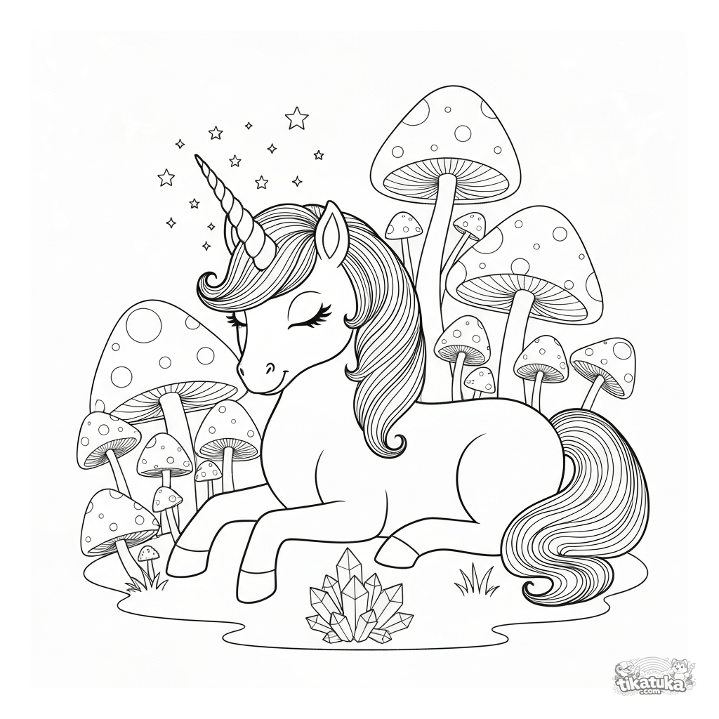 Раскраска с волшебным пони-единорогом, отдыхающим в роще светящихся грибов. Для детей 6-9 лет. Много деталей для творческого раскрашивания.