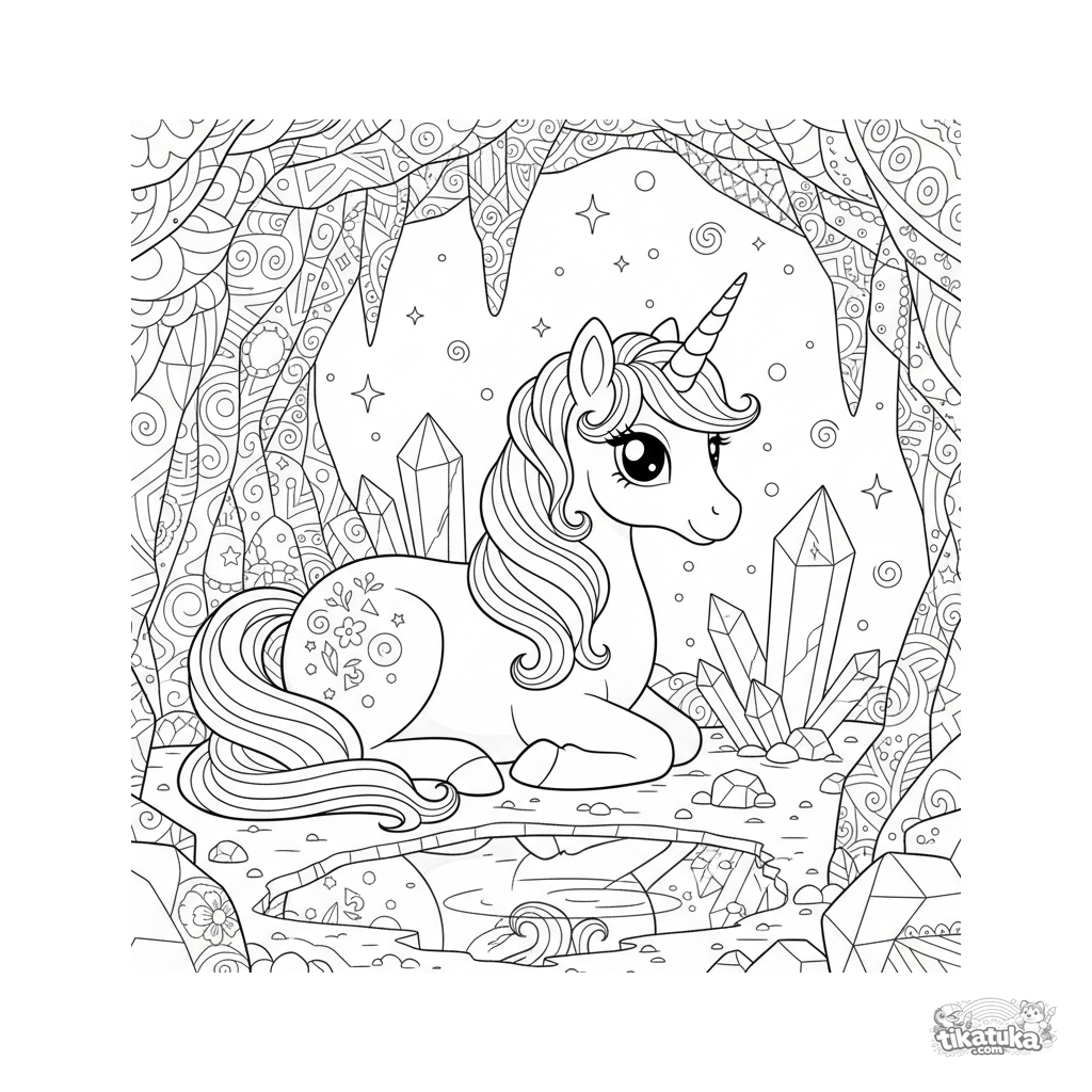 Раскраска с волшебным пони-единорогом, отдыхающим в сверкающей кристальной пещере. Для девочек 5-8 лет. Много волшебных деталей для раскрашивания.