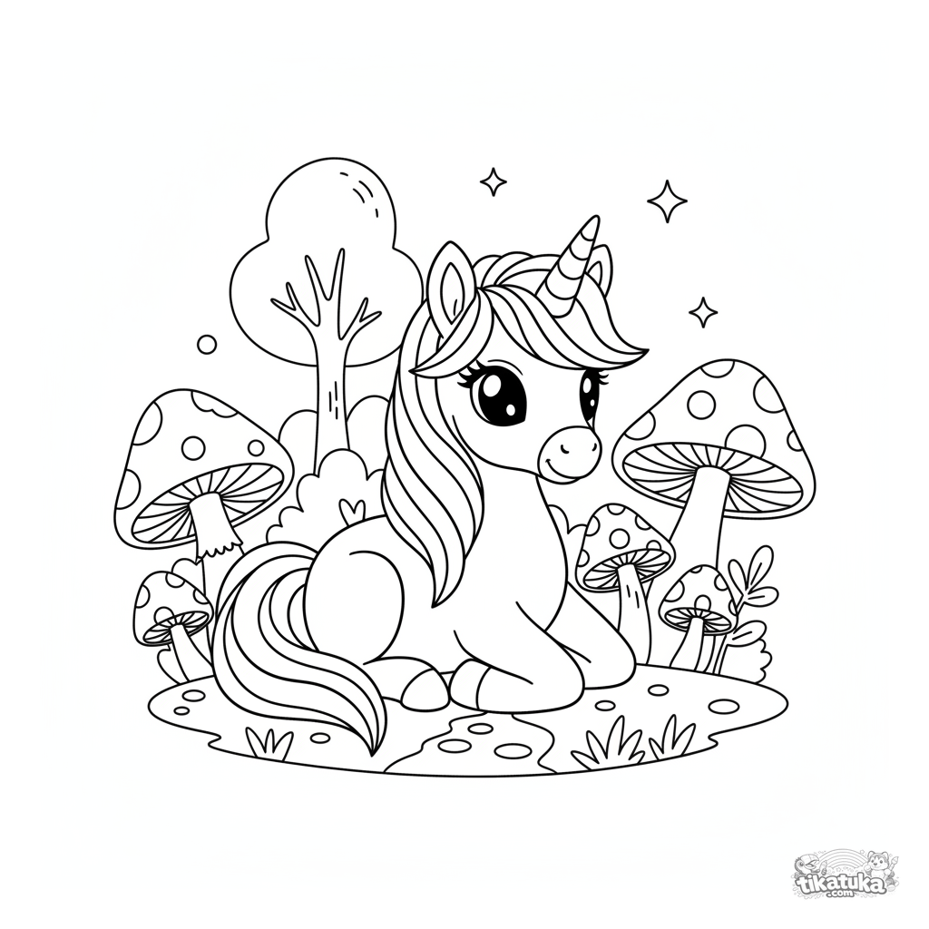 Раскраска для девочек 4-6 лет: волшебный пони-единорог отдыхает в зачарованной лесной полянке среди светящихся грибов. Красивые, плавные линии.