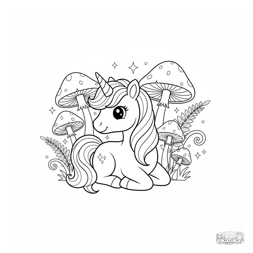 Раскраска для девочек 4-6 лет: волшебный пони-единорог отдыхает в зачарованной роще среди светящихся грибов. Приятные детали, плавные линии, идеально для творчества.